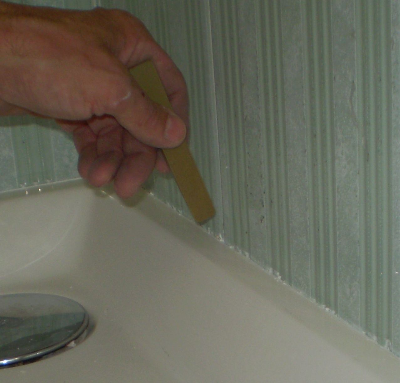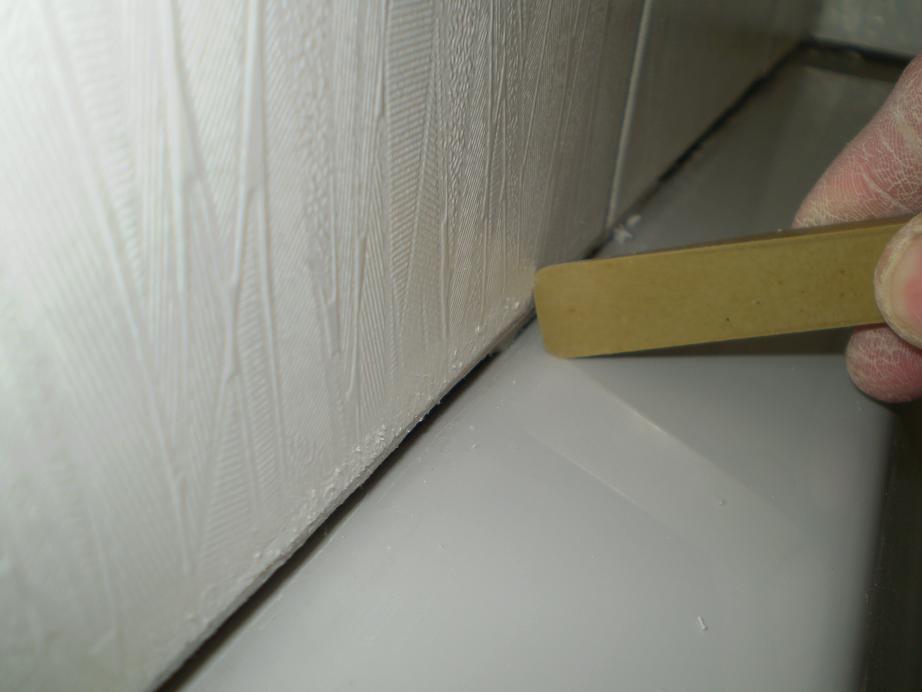 Der Abziehvorgang gleicht eher dem vom früheren Fugholz. Die rel. schmale Abziehkante des Variofug ist völlig ausreichend, weil Silikon auf den mit Trennmittel/Spüliwasser benetzten Flächen nicht klebt.